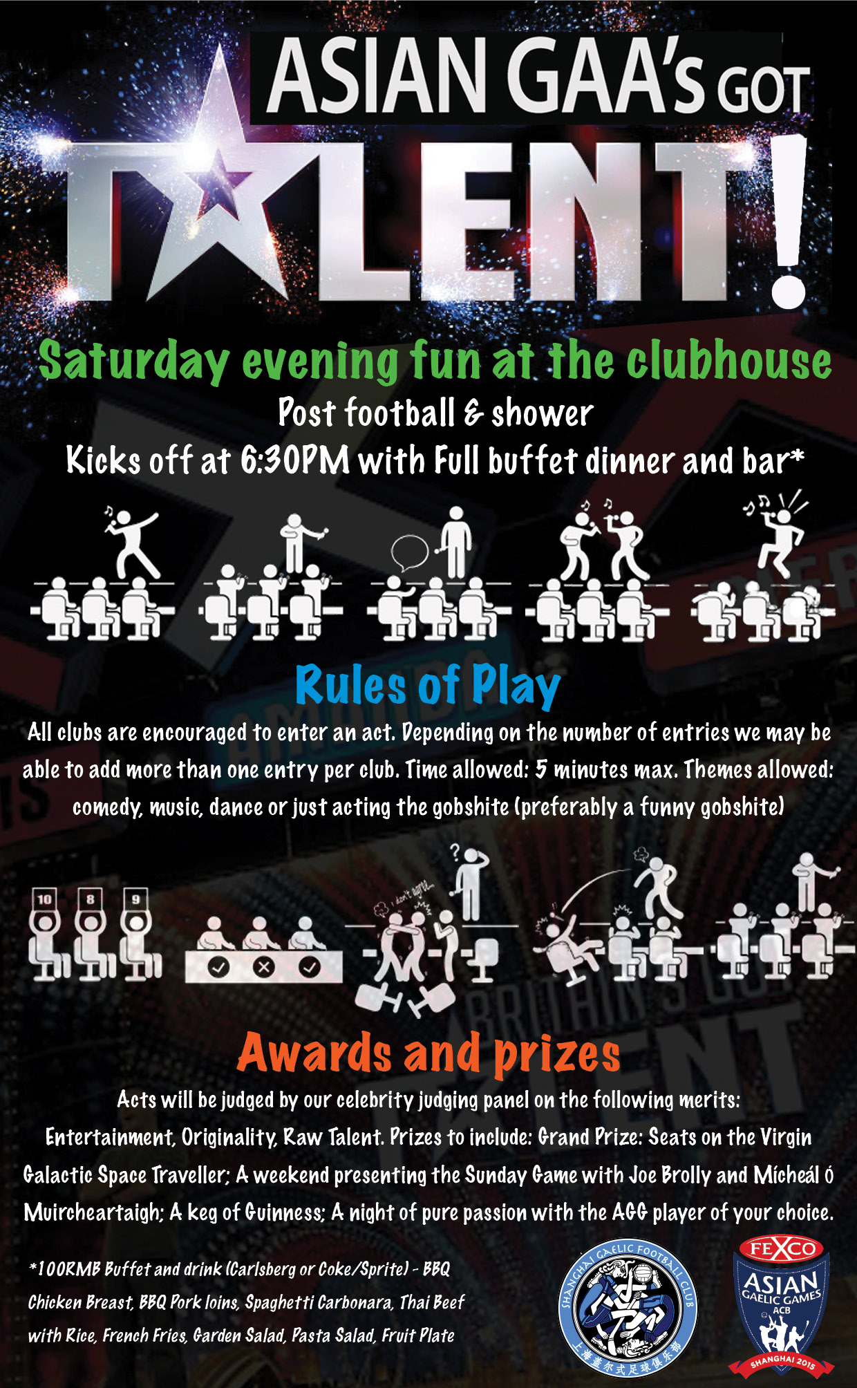Saturday 24th Directly After the Games @ SCSC – Asian GAA’s Got Talent!! A chance to show off and watch some off-field talent with a stage and mike, loads of craic and an all-you-can-eat buffet and drink deal.